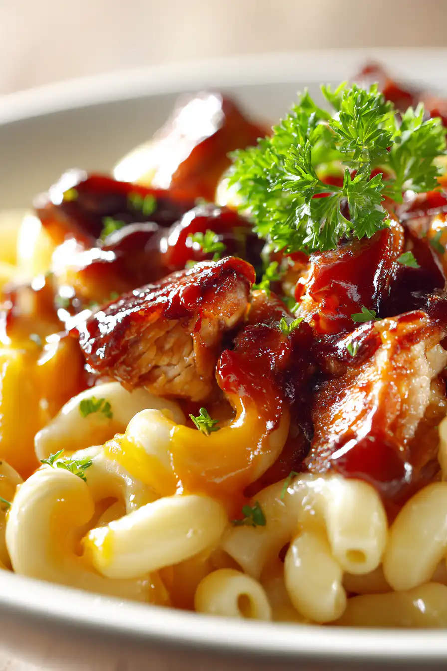 A rich and hearty meal featuring tender chicken thigh pieces glazed with smoky, sweet BBQ sauce and tossed in a creamy homemade cheddar macaroni dish. The combination of textures and flavors makes it an ultimate comfort bowl, perfectly balanced and satisfying for any occasion.